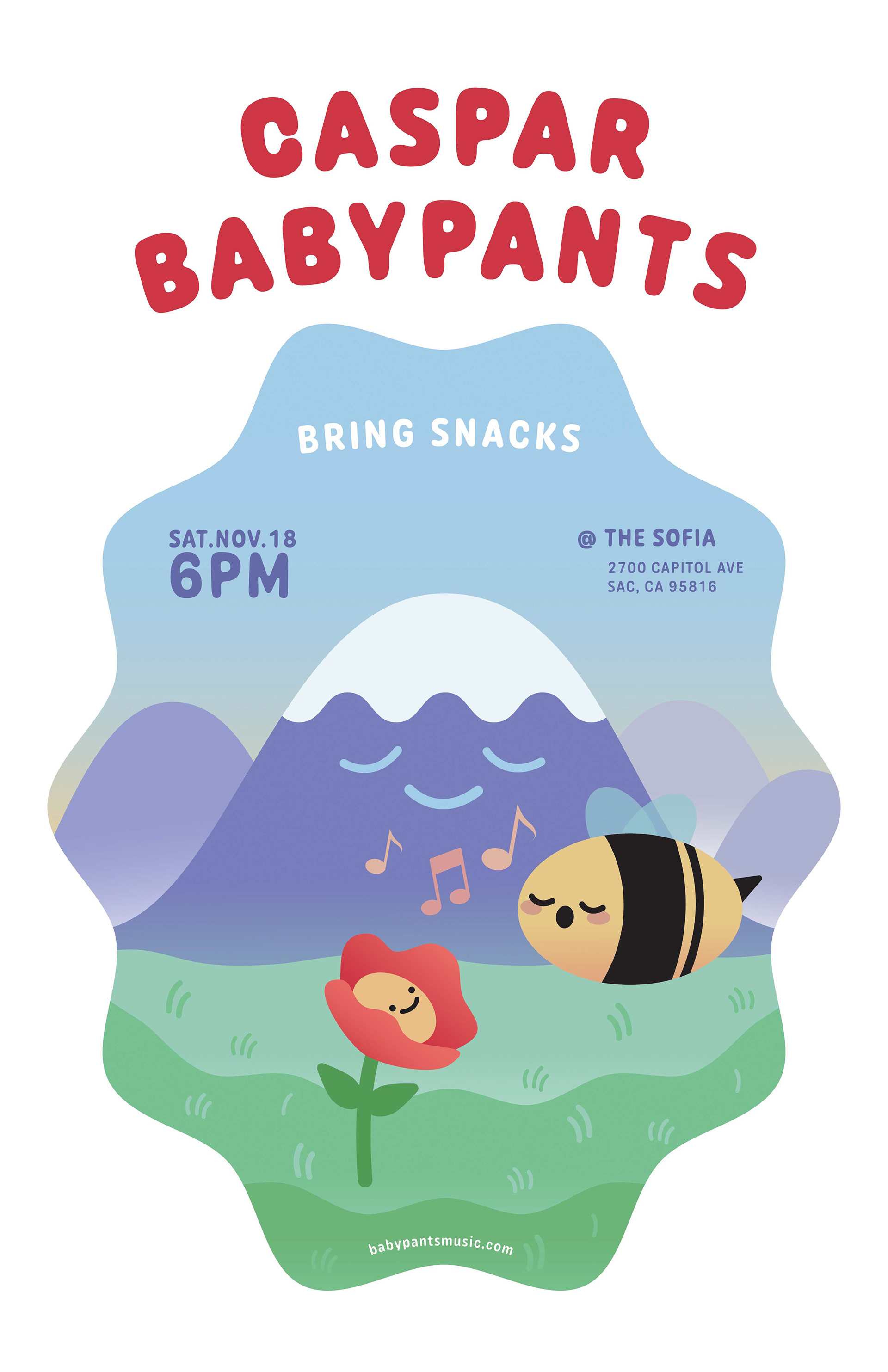Caspar Babypants' music is directed towards children, so there is a sweet and innocent tone throughout their discography. The design is very round to portray a friendly-like personality. Personifying the bee, flower and mountain gives a cartoon feel which resonates with the child audience.