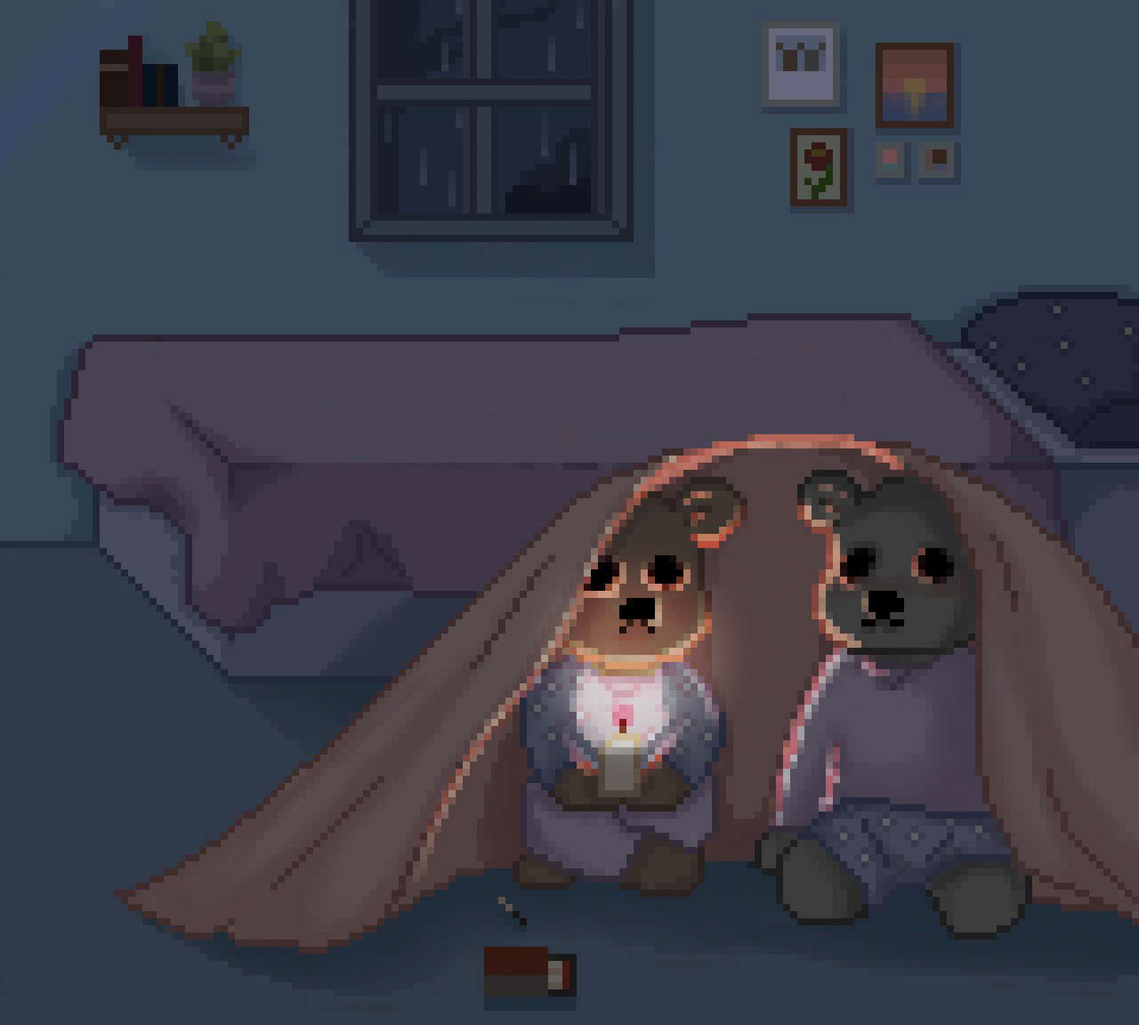 A scene where two sibling bears hide under a blanket, after a rainstorm causes a power outage in their home. They are comforted by the warmth of a lit candle.